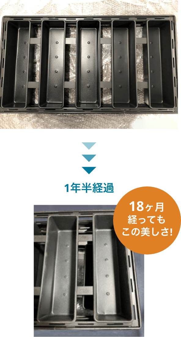従来頻繁に必要だったリコートの問題と離型性の課題を解決しました。18ヶ月間のテストで塗膜剥がれがなく、離型性も問題なし。食パン歩留まりも向上できたとの評価いただきました。ある食パンメーカーの社長からは「この塗料は食パン業界にイノベーションが起きる!」という高評価をいただきました。2024年 約4,000台の受注を予定しています。